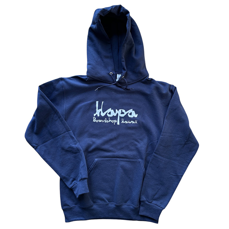 White graphic on navy hoodie