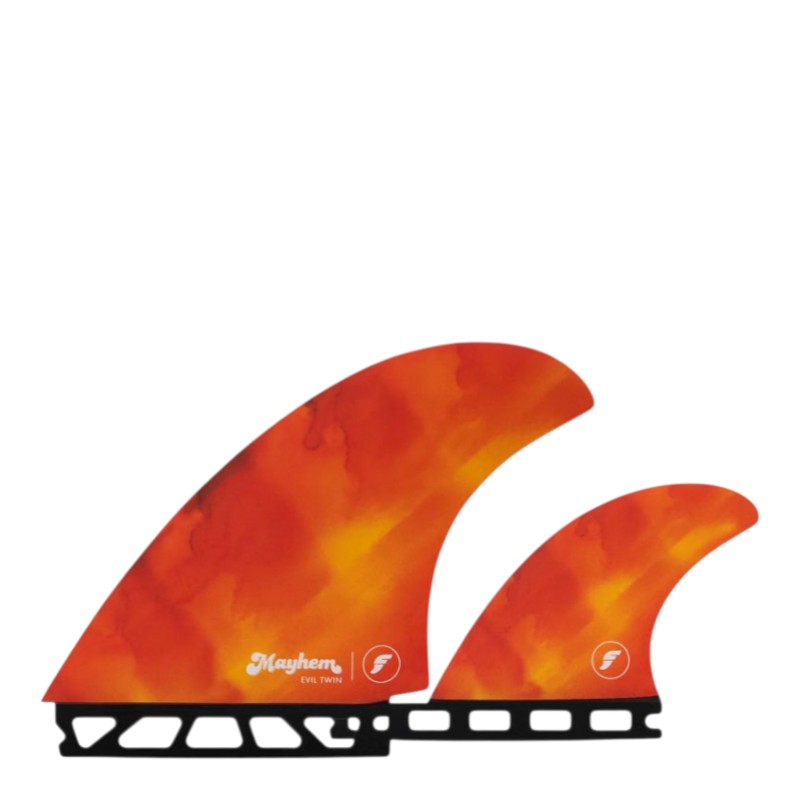 "The Evil Twin" is a twin fin + trailer combo developed not just for the "Evil Twin" board model, but for any boards that revel on twin fin flare. The template is an exact replica of our twin fins designed for our original RNF close to 25 years ago. A friend in Florida recently dug up an actual mid 90's pair of these hand foiled twins and sent them to me, claiming these large surface area fins relevance today. We immediately prototyped with Futures and loved them. An upright fin, with a swept back tip, and plenty of area. They provide drive and precise pivot. We paired them with a smaller than average trailer, which helps draw out turns and lends some stability and projection, yet retains that free feeling, twin fin feel. I recently used a prototype set on my step-ups, solid backside, overhead Indo surf, where I never thought a twin fin would perform so well, I would actually forget I was using them" -Mayhem
