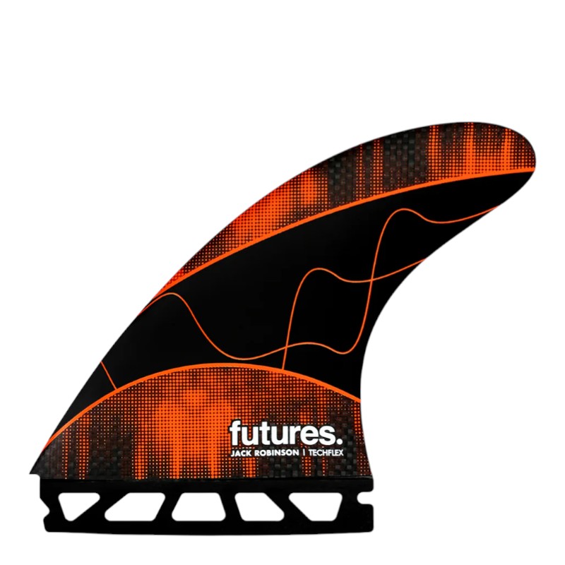 Jack Robinson's signature Techflex thruster fin is a large size fin in the Rake template category. Developed to suit Jack's style of surfing above and below the lip, he has been putting it through the paces at some of the best waves in the world with incredible success. The Techflex construction is Jack's go-to when the waves are pumping and he desires a bit more control from his fins. Techflex fins are engineered to be stiff and light, providing a solid and engaged feel for powerful surfers or powerful conditions. This setup has a smaller center fin that the side fins for increased maneuverability.