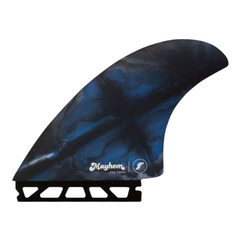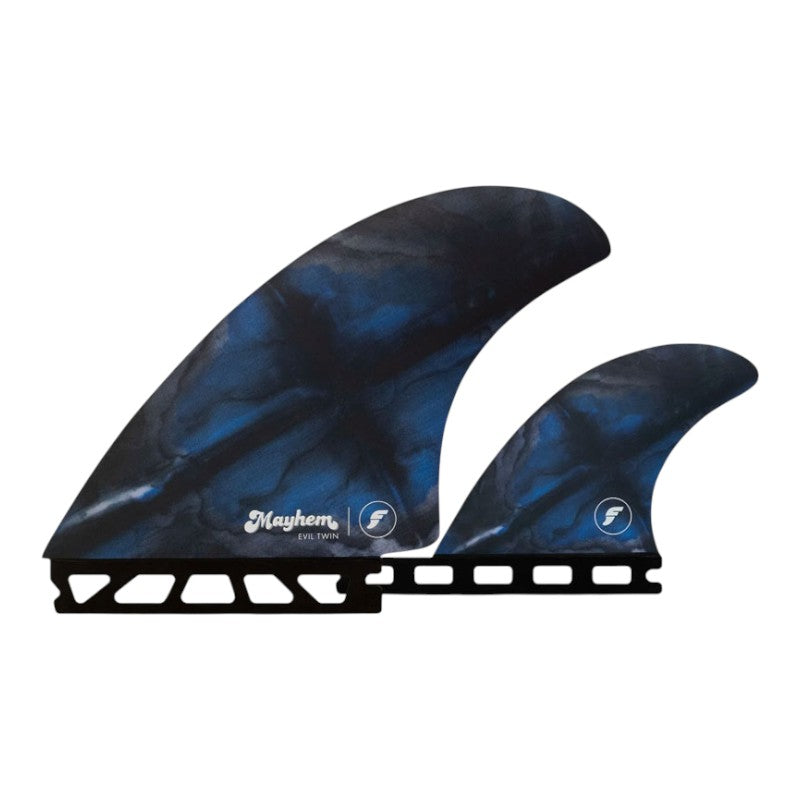 "The Evil Twin" is a twin fin + trailer combo developed not just for the "Evil Twin" board model, but for any boards that revel on twin fin flare. The template is an exact replica of our twin fins designed for our original RNF close to 25 years ago. A friend in Florida recently dug up an actual mid 90's pair of these hand foiled twins and sent them to me, claiming these large surface area fins relevance today. We immediately prototyped with Futures and loved them. An upright fin, with a swept back tip, and plenty of area. They provide drive and precise pivot. We paired them with a smaller than average trailer, which helps draw out turns and lends some stability and projection, yet retains that free feeling, twin fin feel. I recently used a prototype set on my step-ups, solid backside, overhead Indo surf, where I never thought a twin fin would perform so well, I would actually forget I was using them" -Mayhem