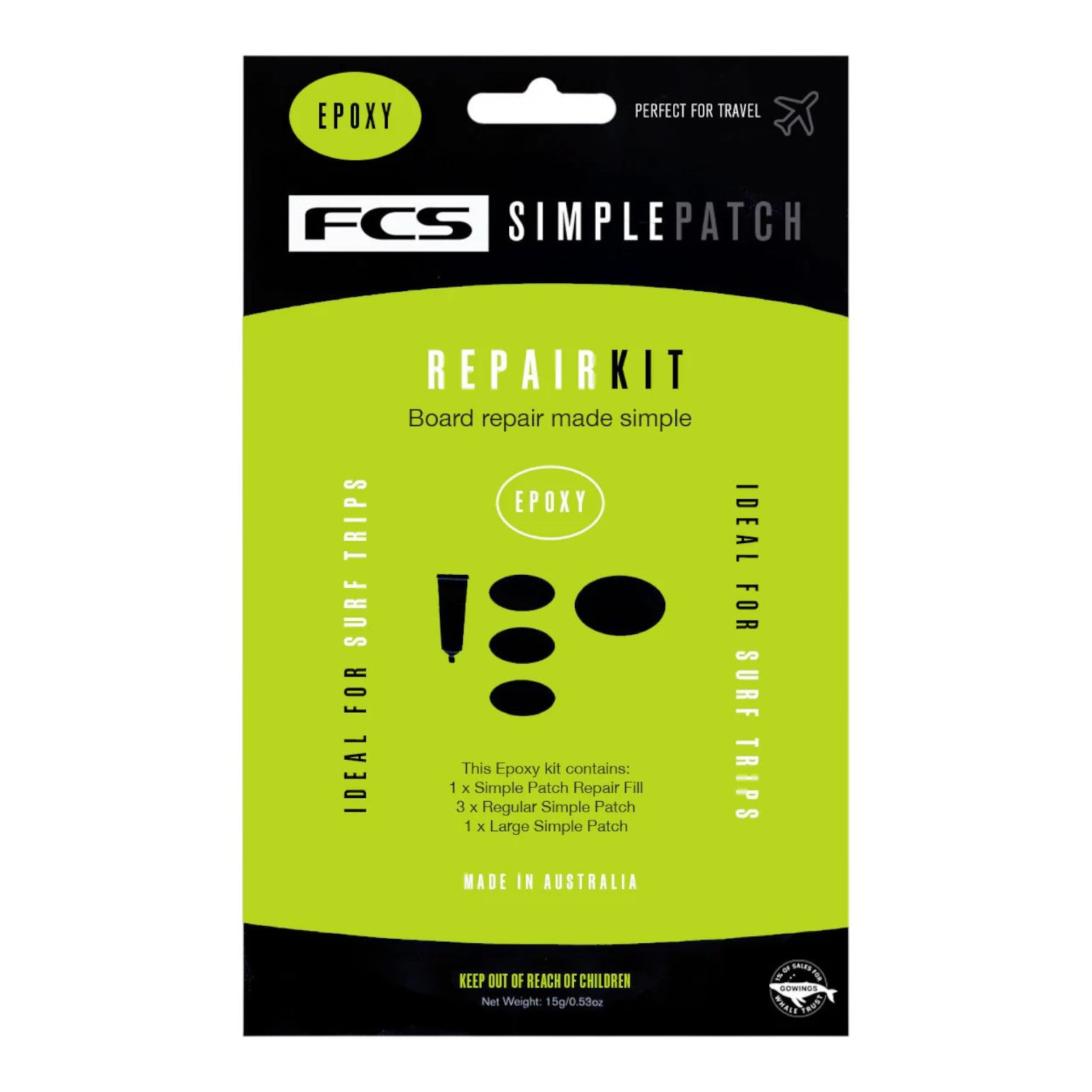 Value Pack – Perfect for 5 – 6 repairs, ideal for any surf trip. Includes: 1 x SimplePatch Large, 3 x SimplePatch Regular, 1 x SpeedFill.